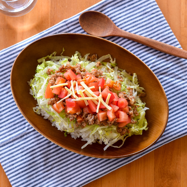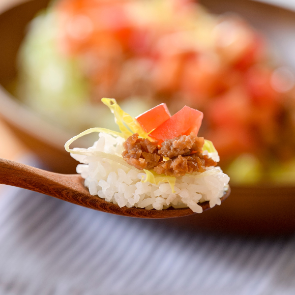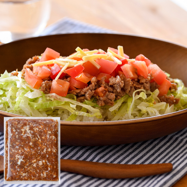 調理:トマトを角切り、レタスを千切りにしておきます。フライパンで本品をほぐしながら炒めます。ご飯、レタス、加熱した本品の順で盛り付けます。カットトマトと細切りチーズをのせてたら完成です!